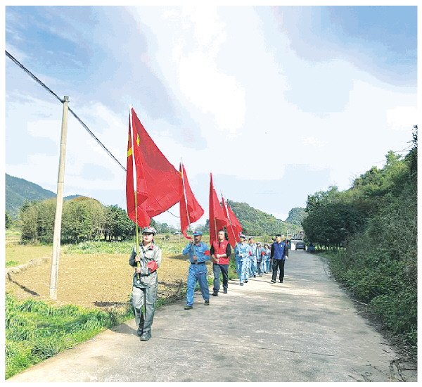 上午9时,全体人员从石塘镇水澄村委出发,徒步前往石脚盆自然村舍生崖烈士遗址。大家步履铿锵,沿途追忆1934年红八军团转战全州的激战岁月,深切感悟革命先烈不畏艰险、奋勇拼搏的英雄气概。在行走中传承红色基因,在感悟中汲取奋进力量。