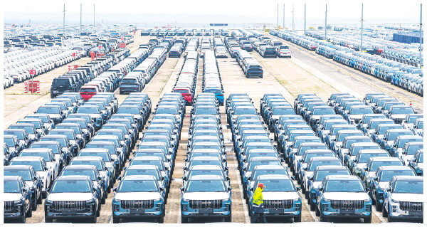 ◥4月10日,在山东港口烟台港,出口的商品车等待装船发运(无人机照片)。