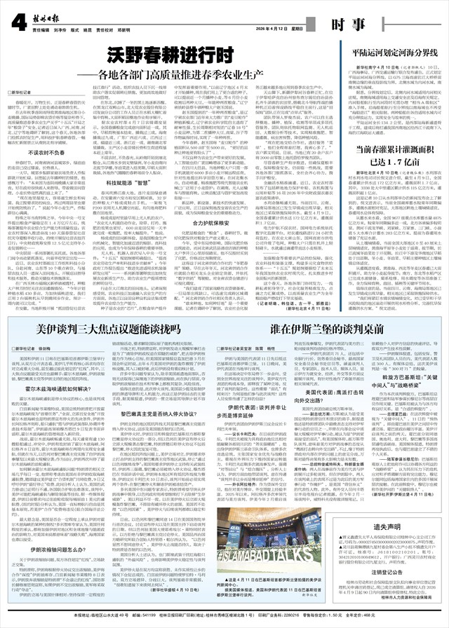 在广西玉林市福绵区新桥镇被霞村,种粮大户林芳时时关注农田灌溉情况:“今年计划种植水稻430多亩,为加快插秧进度,我们正用2台插秧机从早到晚同步作业,预计一周内就可以完成。”