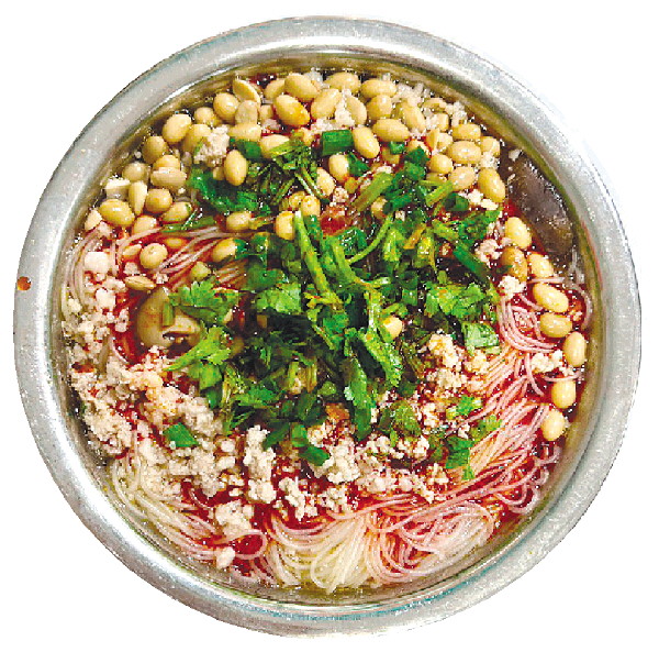 在操作区域,记者目睹了出榨米粉的全过程。谢明荣将特制模具放入榨粉机,再放入提前准备好的米块,轻轻按压操作杆,一根根纤细的米粉便顺势落入滚烫的沸水中,瞬间定型,捞出后立即过冷水,锁住脆弹口感。操作台上,一口大锅里的骨汤正咕咕冒泡,香气四溢,员工熟练地烫粉、舀汤,洁白的米粉上铺上肉末、黄豆,撒上葱花、香菜,最后淋上一勺色泽红亮的红油,瞬间给这碗粉注入了灵魂,搅拌开来,红油均匀裹住每一根米粉,香气扑鼻。记者随即品尝了一碗热汤红油米粉。粉体弹脆爽滑,骨汤鲜辣醇厚,黄豆一抿即化,肉末的咸香与红油的脂香在口中交织,层次分明。