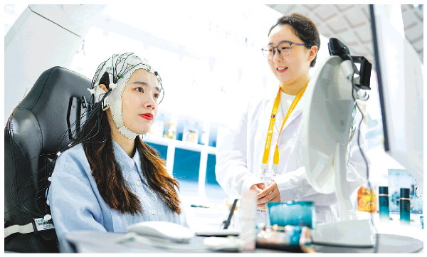4月14日,展商在消博会现场展示美妆多维全息AI感官行为研究系统。