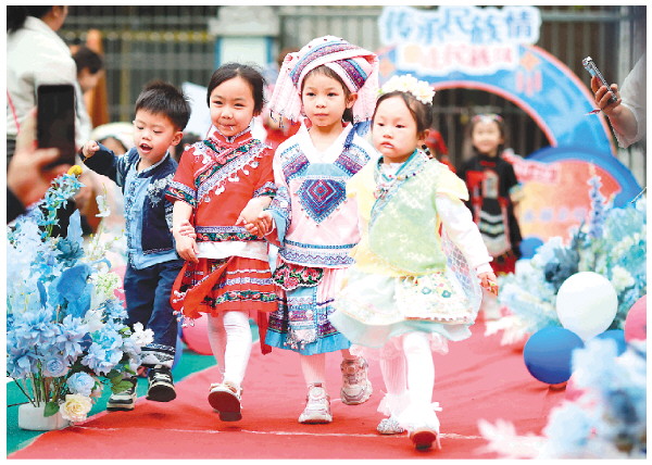 活动中,孩子们与家长走秀、参与文艺表演,同步体验射柳、抛绣球等11项民俗游戏,共享壮乡长桌宴。