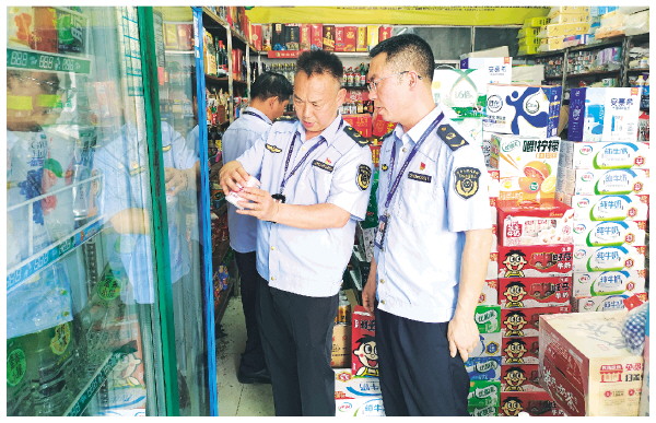 ◥执法人员在检查校园周边食品。 阳宇晖 摄