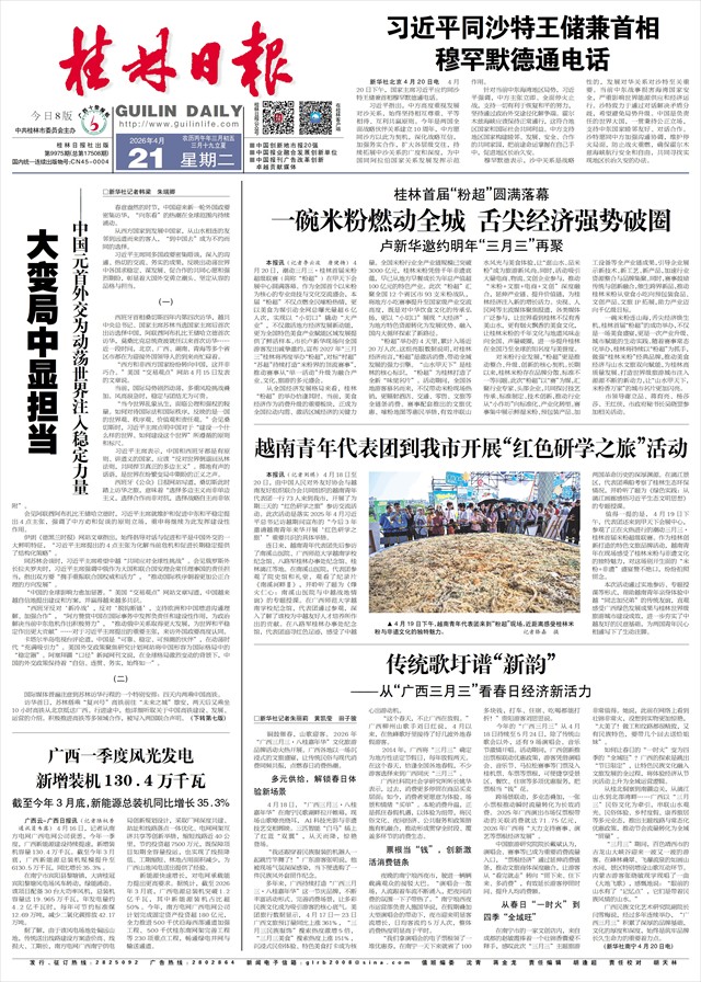 广西云-广西日报讯(记者陆权香 通讯员韦露)4月16日,记者从南方电网广西电网公司获悉,今年一季度,广西新能源建设持续提速,新增装机容量130.4万千瓦。截至今年3月底,广西新能源总装机规模提升至6130.5万千瓦,同比增长35.3%。