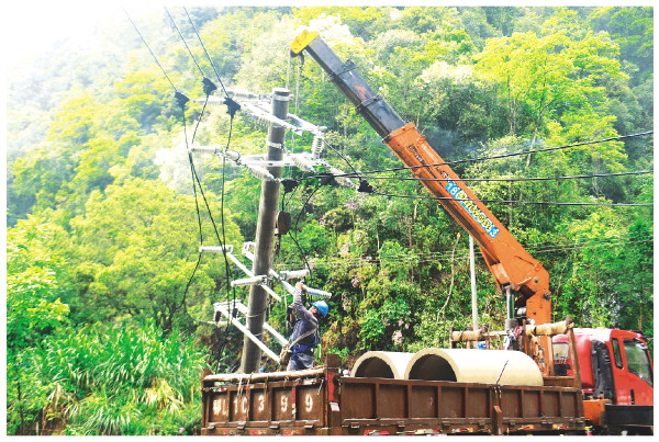 4月21日,在龙胜各族自治县龙脊镇金江村,南方电网龙胜供电公司工作人员在抢修电力设施。