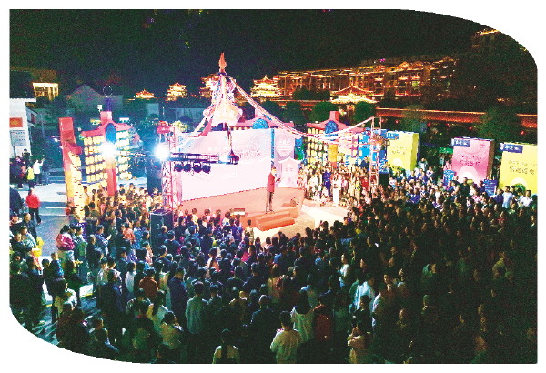 随着夜幕降临,灯光渐次亮起,一场融合了民俗表演与趣味拍卖的夜间盛宴正在举办。李旭东 摄