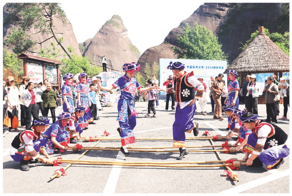 在丹霞八角寨景区,游客与工作人员共同体验竹竿舞。康昌荣 摄