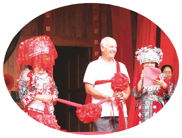 外国游客幸运接住绣球,被现场的红绸与欢呼声簇拥上台,体验了一场别开生面的苗家婚俗仪式。潘孟阳 摄