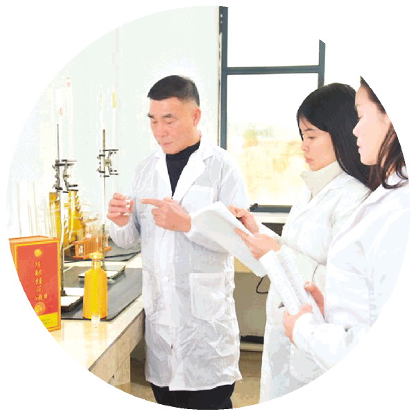 ▼徐文强(左)跟团队一起研发新的桂花酒产品。