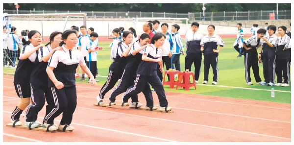 随着一声发令枪响,三人板鞋竞速赛场上,各队三名队员同穿一双长板鞋,喊着整齐的“左、右、左”口号,步调一致奋力冲向终点。有的队伍配合默契,如履平地,引来观众阵阵喝彩;有的队伍板鞋脱落,但队员们毫不气馁,手挽手重新站起,迅速重拾节奏冲向终点。