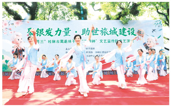 本报讯(记者陈静 文/摄)4月23日上午,伏波山公园广场歌声阵阵,由市委老干部局和市离退休干部工作委员会共同主办的2026年“聚银发力量,助世旅城建设”离退休干部文艺演出在这里举行。市老年大学文艺舞蹈队、市老干部合唱团、文彩艺术团、常青艺术团以及秀峰区、叠彩区离退休干部文艺团体的300多名老同志参加演出,为市民游客带来一场精彩文艺表演。