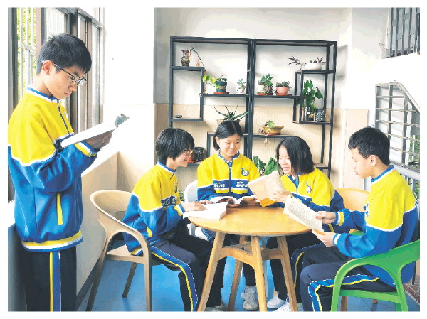 课余时间,中学生在读书角开展阅读、分享心得。