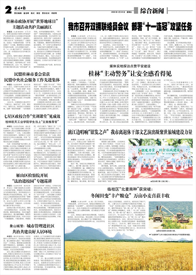 主题活动共护美丽漓江   本报讯(记者唐健扬)4月23日,桂林市政协联合桂林市环境保护产业协会和委员企业恒晟水环境治理股份有限公司,在桃花江(临桂段)开展2026年“世界地球日”主题活动。活动以“珍爱自然资源 守护美丽漓江”为主题,聚焦桃花江流域水环境综合治理、水生态修复与保护,在“4·25漓江保护日”即将到来之际,进一步营造全社会共护漓江的浓厚氛围。