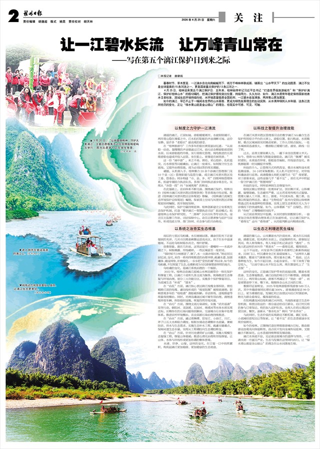 4月25日,桂林迎来第五个漓江保护日。五年来,桂林始终牢记习近平总书记“打造世界级旅游城市”和“保护好漓江、保护好桂林山水”的殷切嘱托,把漓江保护摆在突出位置,持续用力、久久为功。如今,漓江水质常年稳定保持国家地表水Ⅱ类标准,流域生态环境持续向优,水环境质量稳居全国前列,一江碧水愈发清澈,两岸青山更加葱茏。