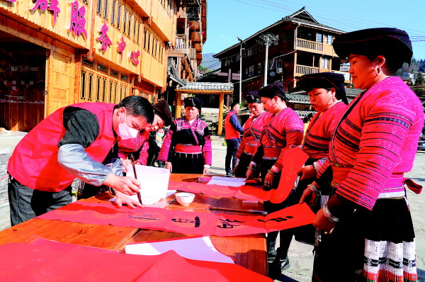 连日来,龙胜各族自治县组织书法爱好者和摄影志愿者到各村寨开展“我们的节日·春节”助力乡风文明文化志愿服务活动,为当地群众书写春联和免费拍摄全家福,为他们送上一份别出心裁的新年礼物和美好祝福,也为即将到来的兔年春节增添喜庆祥和的节日氛围。图为近日龙胜各族自治县新时代文明实践总队在龙脊镇大寨村开展“我们的节日·春节”助力乡风文明文化志愿服务活动。于琳钰 摄