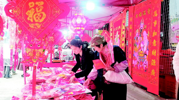▲1月14日,是灵川县潮田乡的圩日。当天上午,长长的年货摊上摆着琳琅满目的特色农产品和年货,前来赶圩的群众熙熙攘攘,整条街都洋溢着浓浓的年味。大家都忙着在摊位上选购,他们把中意的春联买回家,把“福”请回家,红红火火迎新春。 记者秦丽云 摄