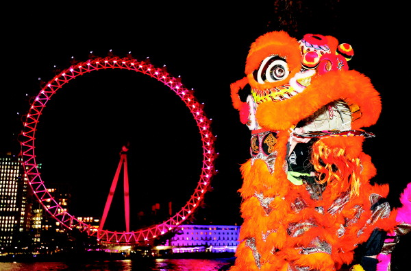 ▲1月13日,在英国伦敦,演员在亮起红色灯光的“伦敦眼”前表演舞狮。