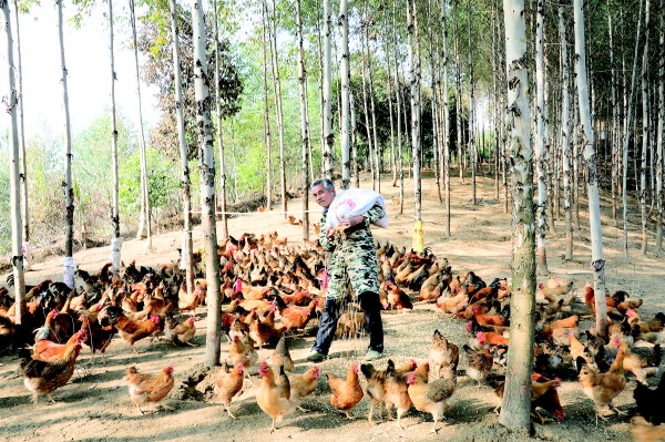 唐石玉的林下鸡在附近村民和周围乡镇群众中已小有名气,他们开着车来到鸡场,一次就买二三十只。“一年收入20万元不成问题。”唐石玉脸上露出满意的笑容。