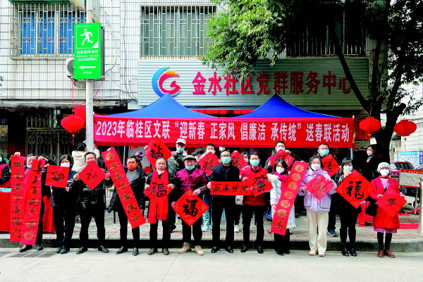 1月18日上午,临桂区文联到金水社区开展“迎新春 正家风 倡廉洁 承传统”送春联活动,既送福也传“廉”。活动中,书法家现场为社区党员干部和群众义务书写春联,把党的廉政声音、优良家风家训以春联祝福的形式传送到千家万户。近日以来,临桂区文联组织书法家们先后到宛田瑶族乡、碧桂园、公园大地、枫林美食街等写春联送福字,送出新春对联和福字近千份。田亚 摄