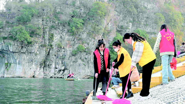 象山街道文明社区“环保妈妈”在象山景区为江岸“洗脸”。记者韦莎妮娜 摄