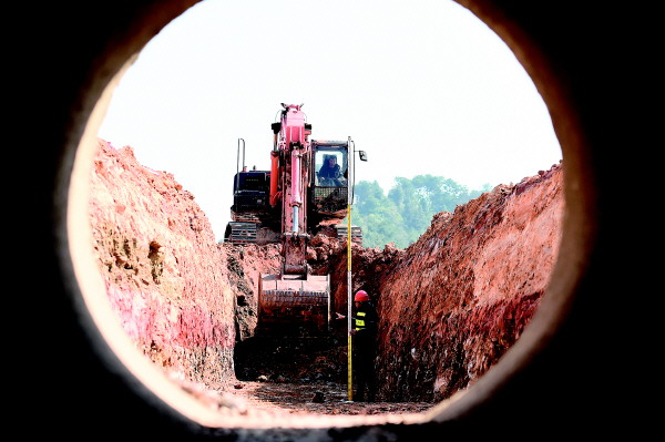 挖掘机在挖土埋设管道。记者李忠波 摄