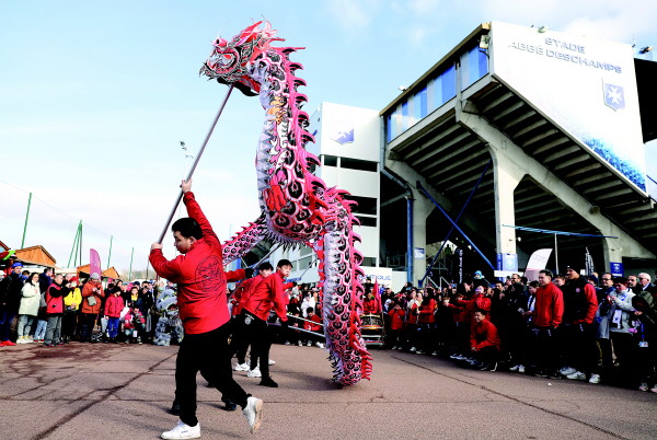 这是1月29日在法国欧塞尔足球俱乐部主场阿贝·德尚体育场外拍摄的舞龙表演。