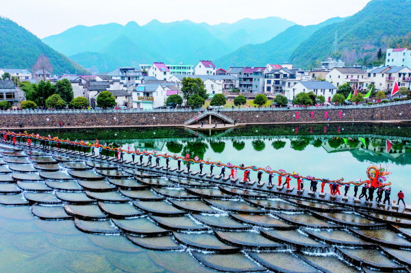 2月1日,窈口村女子板龙队在湖源乡的龙鳞坝碇步桥上进行舞龙表演(无人机照片)。