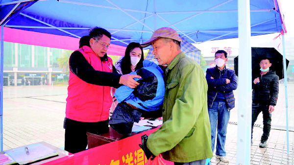 ▲工作人员将御寒衣物送到衣着单薄的遇困群众手中。