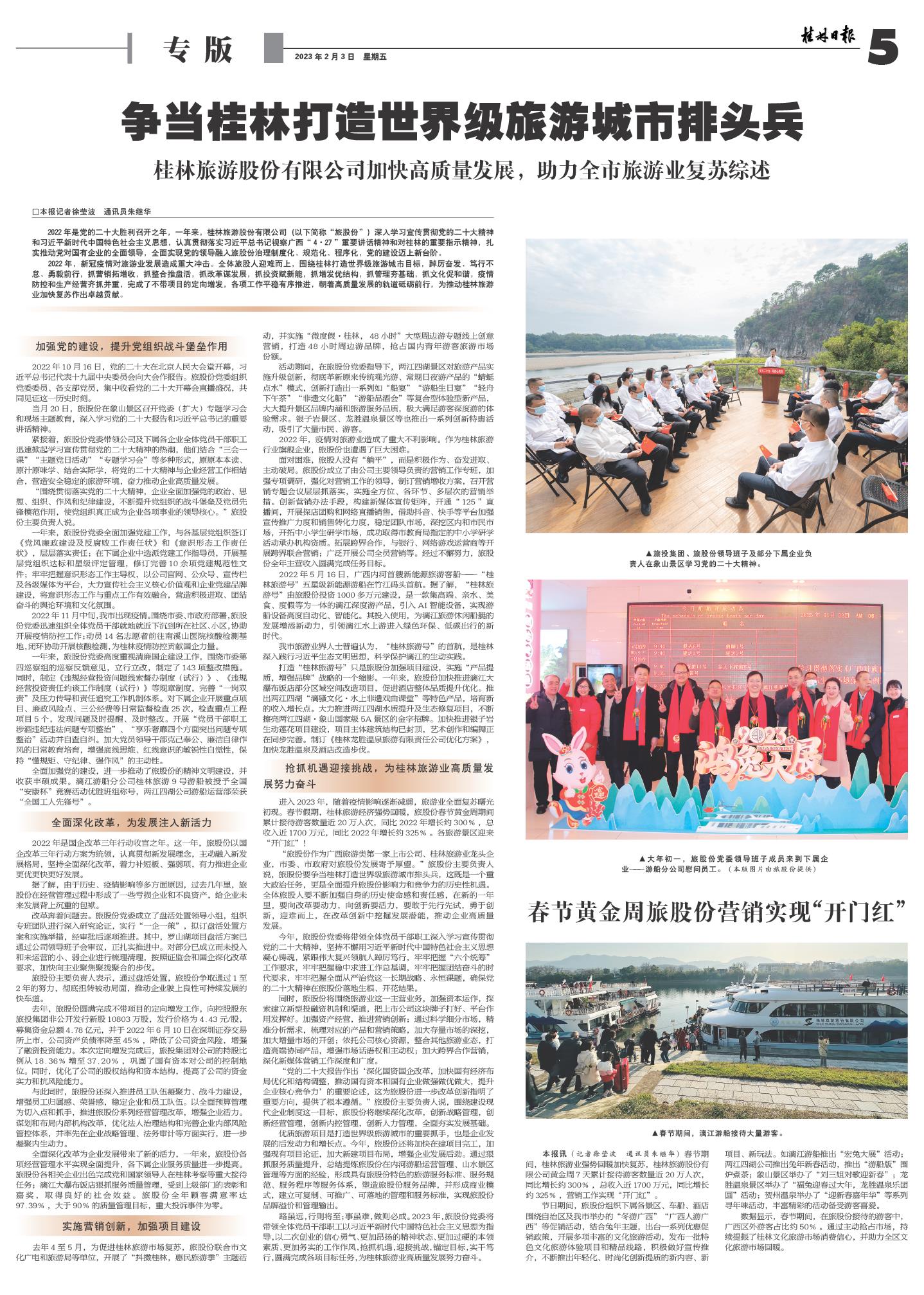 2022年,新冠疫情对旅游业发展造成重大冲击。全体旅股人迎难而上,围绕桂林打造世界级旅游城市目标,踔厉奋发、笃行不怠、勇毅前行,抓营销拓增收,抓整合推盘活,抓改革谋发展,抓投资赋新能,抓增发优结构,抓管理夯基础,抓文化促和谐,疫情防控和生产经营齐抓并重,完成了不带项目的定向增发,各项工作平稳有序推进,朝着高质量发展的轨道砥砺前行,为推动桂林旅游业加快复苏作出卓越贡献。
