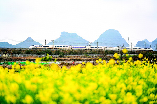 一列“和谐号”动车组正行驶在贵广高铁桂林临桂段。黄勇丹 摄