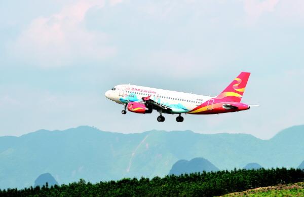 桂林航空公司的印有桂林山水美景彩绘图案的“桂林号”客机,正载着旅客从桂林两江国际机场起飞。记者唐艳兰 摄