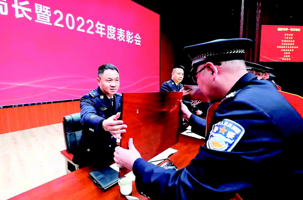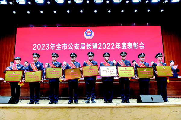 本报讯(记者陈静)台上为获嘉奖的个人和单位颁奖,先进典型发言,台下掌声如潮……2月13日上午,2023年全市公安局长暨2022年度表彰会在市公安局2楼礼堂举行。表彰会现场,市公安局对被记功嘉奖的500余个人和集体进行表彰。