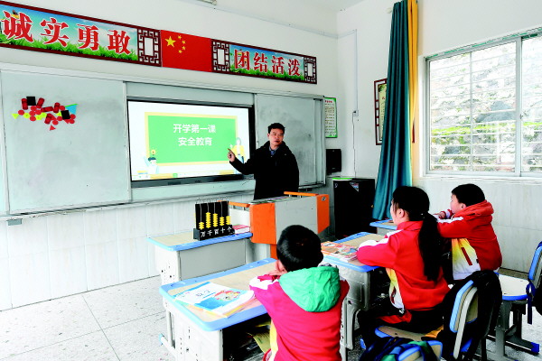 3个学生同在一间教室,蔡教宏一直采用复式教学方式给学生授课。虽是“微小学”,但多媒体课堂设备、体育设施、空调等一应俱全。他在开学第一课,给孩子们进行了安全教育。
