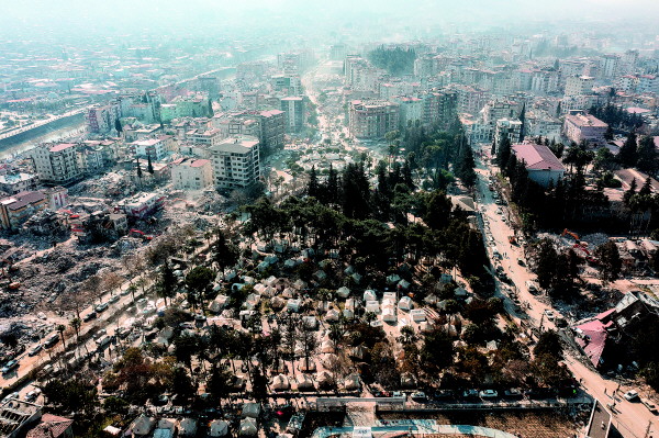 ▲这是2月12日在土耳其哈塔伊省安塔基亚市中心拍摄的地震废墟和救援帐篷(无人机照片)。 新华社发(穆斯塔法·卡亚 摄)