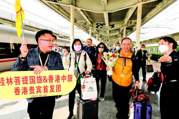 本报讯(记者李思静 唐健扬)2月20日下午,桂林北火车站迎来一支久违的入境旅游团队。据了解,这是内地与港澳入出境团队游恢复后,首个由香港赴桂林的入境旅游团。该团由20名香港游客组成,由香港中国旅行社组织,桂林菩提国际旅行社有限公司负责落地接待。他们从香港启程,经停深圳,乘坐G2904次动车于当日抵达桂林,开启了为期四天三晚的桂林踏青之旅。