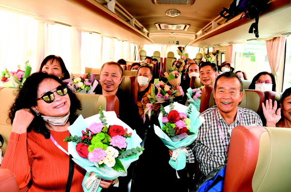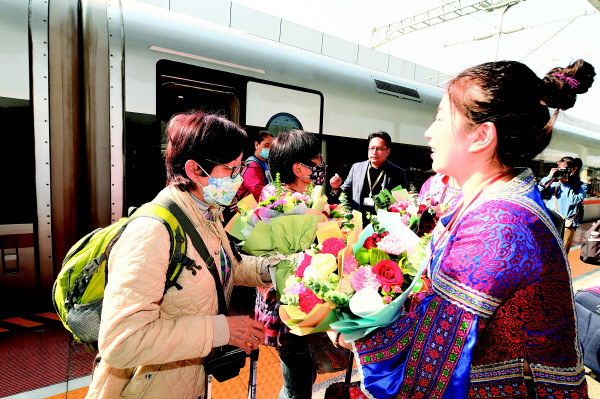 身着少数民族服饰的引导员手捧鲜花,欢迎香港游客的到来。