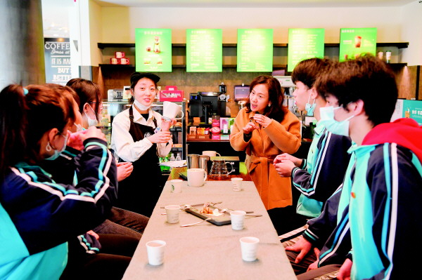 本报讯(记者孙敏 唐艳兰 文/摄)“手冲咖啡需要几个步骤,首先拿出滤纸折叠好,然后倒入磨好的咖啡粉,徐徐注入热水……”2月28日上午,市聋哑学校的师生代表走出校园,来到星巴克梦之岛店,在咖啡师手把手教学下,完成了一堂咖啡知识的体验课。