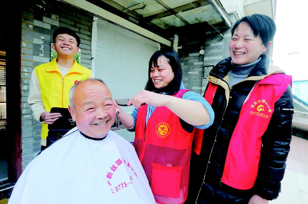 本报讯(记者陈静 文/摄)2月28日一早,“新丝璐”义务剪发志愿者小分队和建干北社区的志愿者就拎着箱子,入户为特扶家庭老人熊大爷理发。一边帮熊大爷理发,志愿者一边跟老人拉家常,一会儿工夫就帮熊大爷理了个新发型。享受着足不出户的便捷服务,熊大爷脸上乐开了花。“不仅理得专业,也很漂亮、干净。”