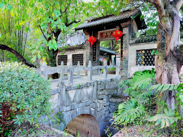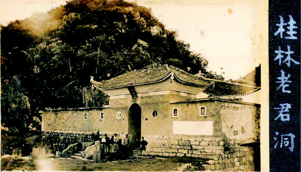 当然,民国时期记录华盖庵最重要的载体是照片。作为知名景点隐山六洞的必经之处,华盖庵频繁出现在相机中。现在能找到的华盖庵老照片不下十张,而且基本上各个角度都有,为我们呈现了这座清末小庵的样貌:入门为一座小型石拱桥,这是佛寺营建的常见手法,即用桥来分隔佛界与凡世。过桥即山门,山门上方的匾额书“招隐”二字,取自张栻手书;山门两边墙体各开二孔,分别镶嵌“隐”“山”“六”“洞”四个字。进山门数米为一道隔墙,开月洞门。进月洞门后,左为大殿和配殿,右为禅房。大殿、配殿并列,均为砖墙围护的木结构三开间,抱头梁与檐柱间雕有木狮斜撑;殿前有三足宝鼎香炉;禅房亦为两组三间并列,中开八扇隔扇门,左右为支摘窗。建筑风格颇具桂林传统地方特色。寺后朝阳洞前建有两座亭阁。