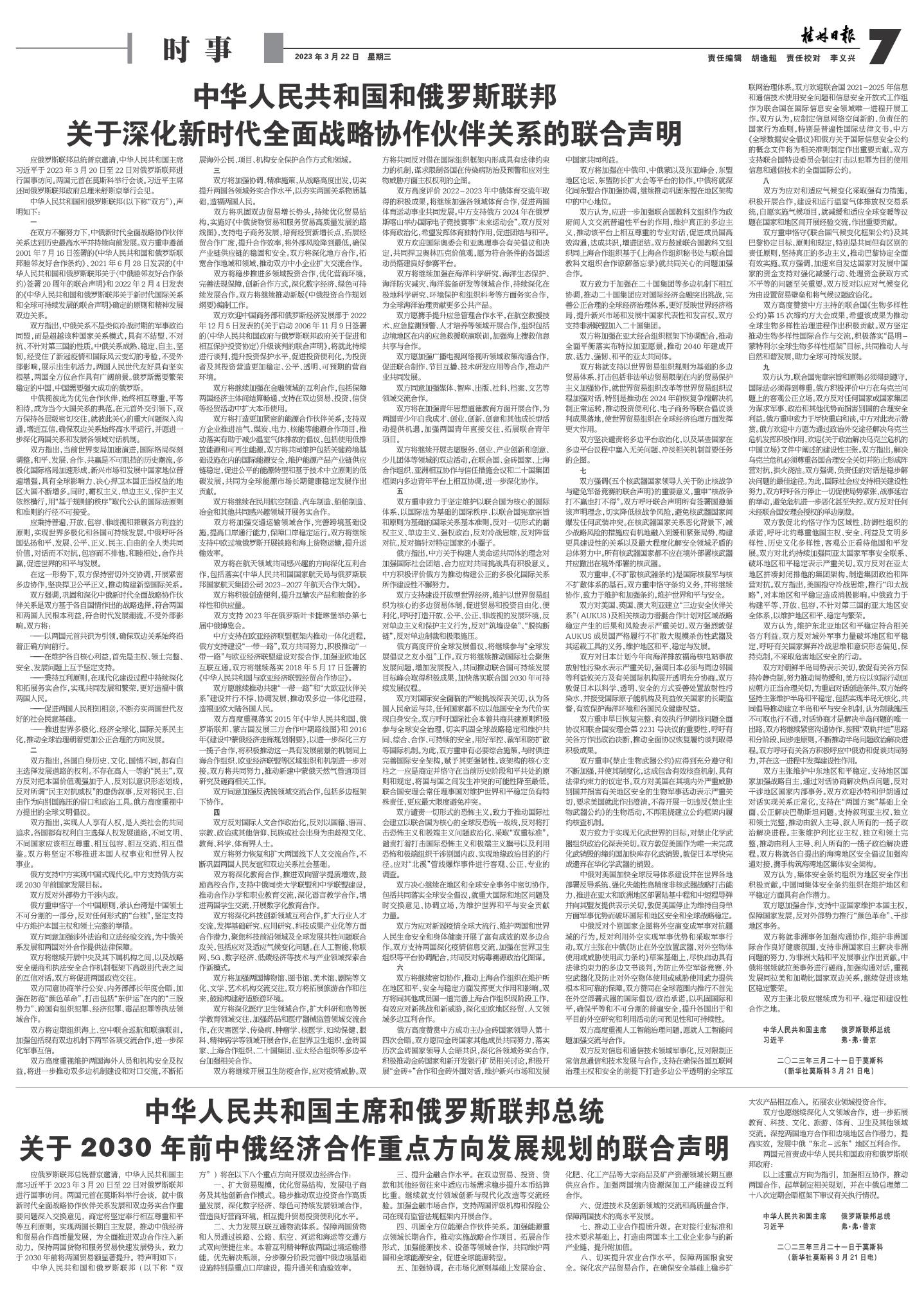 应俄罗斯联邦总统普京邀请,中华人民共和国主席习近平于2023年3月20日至22日对俄罗斯联邦进行国事访问。两国元首在莫斯科举行会谈,就中俄新时代全面战略协作伙伴关系发展和双边务实合作重要问题深入交换意见,商定将坚定奉行相互尊重和平等互利原则,实现两国长期自主发展,推动中俄经济和贸易合作高质量发展,为全面推进双边合作注入新动力,保持两国货物和服务贸易快速发展势头,致力于2030年前将两国贸易额显著提升。特声明如下: