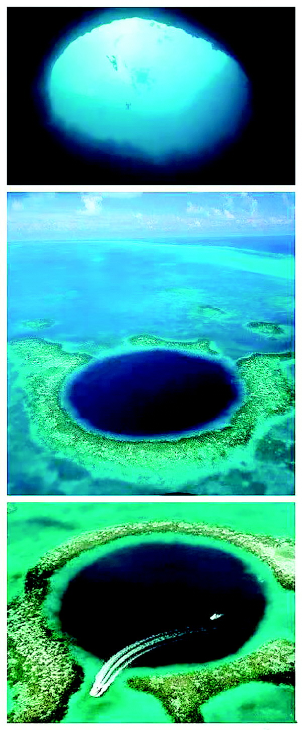洪都拉斯大蓝洞是在冰河时代末期形成的一个石灰石坑洞,是世界十大地质奇迹之一,位于中美洲加勒比海西岸伯利兹约100公里(故又称伯利兹大蓝洞)。在二百万年前的冰河时代,急冻将水冻结在地球的冰冠和冰川中,导致海平面大幅下降。因为淡水和海水的交相侵蚀,这一片石灰质地带形成了许多岩溶空洞,蓝洞即是岩洞之一。而随着日后的重力与地震,很巧合地坍塌出一个近乎完美的圆形开口,成为敞开的竖井。当冰雪消融、海平面升高后,海水便倒灌入竖井,大自然的杰作宣告收工完成!由于洞很深,因此呈现出深蓝色的景象,这一结构在世界上被称为“蓝洞”。