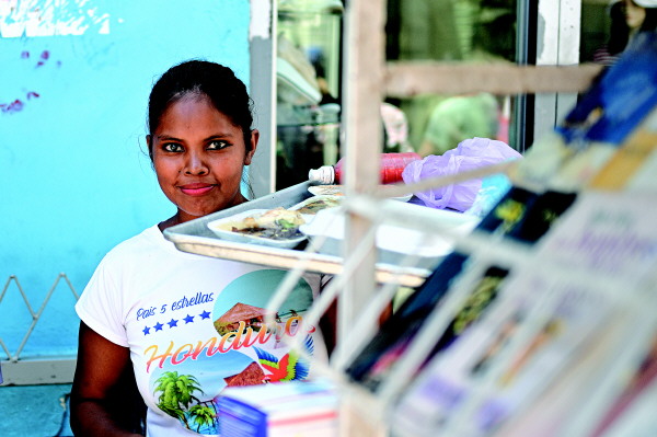 3月26日,一名女子在洪都拉斯首都特古西加尔巴的一处街道上售卖小吃。 新华社记者辛悦卫 摄