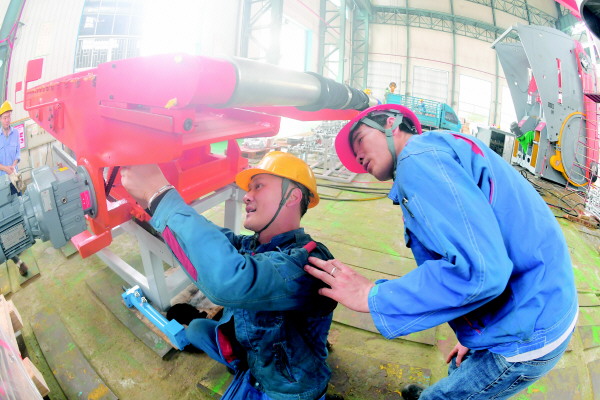 图为公司工人正在组装轮胎硫化机。记者唐艳兰 通讯员李先茂 摄