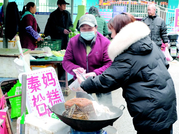 □本报记者张婷婷 文/摄 靠着一辆小推车、一口锅、一个炉,每天早上7点,“秦妈松糕”就这样在七星区六狮洲菜市开锅!摊主秦香荣从十几岁开始就跟着奶奶、妈妈学做松糕。对她而言,做松糕不仅是一门生意,更是一种手艺的传承。 今年67岁的秦香荣卖过果蔬,也做过菜农,但她始终没有放弃做松糕这门家传手艺。秦香荣回忆说,小时候,家里没有太多吃的东西,松糕就是童年快乐的源泉。母亲做的松糕松软香甜、美味可口,不仅让家人大饱口福,还获得了邻里乡亲的认可。每当逢年过节,或是遇上结婚、做寿、乔迁等喜事,街坊邻居都会找母亲帮忙制作松糕。“糕”谐音“高”,寓意“步步高升”,大家都喜欢这道好吃好看好彩头的小吃,母亲也俨然成了村里松糕的代言人。 打小看着母亲制作松糕,在耳濡目染中,秦香荣也掌握了做松糕的技艺。长大后,秦香荣从母亲手上接过“接力棒”,继续为乡亲们制作松糕,将这门祖传手艺传承下去。每年过年前,都是秦香荣最忙的时候,每天都要做几十个松糕,家里的火炉从早烧到晚,她和女儿经常忙得连饭都来不及吃。 “松糕好不好吃,食材、配比和火候都要掌握好,只要有一个工序不对,就会影响口感。”秦香荣告诉记者,她们家的松糕以糯米和粘米为主要原料,先用机子磨成粉,再混合芋头、猪肉丁、葱花等食材,再层层撒入蒸桶中蒸制,整个过程大概需要两个小时。 如今,桂林市面上一些松糕店对制作技艺和方法进行了改良,但秦香荣始终沿袭母亲传承下来的手艺,成为不少顾客津津乐道的传统老味道。在顾客的多次提议下,去年下半年,秦香荣和女儿在漓江东岸六狮洲开起“秦妈松糕”小店,每天凌晨三四点早起准备食材、制作松糕。“店铺离菜市并不远,但我更喜欢菜市场的热闹和烟火气,就一直在这里摆摊。”熙熙攘攘的菜市里,秦香荣的小摊虽然看着不起眼,却不乏人气,出摊不到3小时,20多斤松糕就卖完了。 就在不久前,“秦妈松糕”这道传统民间小吃还与桂林星级饭店的美食菜肴同台竞技,从80多道美食中脱颖而出,一举拿下桂林市首届民间美食厨艺大师奖,排名第三。“第一次参加比赛,看到竞争对手不少来自大饭店、大餐馆,紧张得手心发汗。”秦香荣坦言,参加比赛主要是想开开眼界,学习别人的手艺,听听专家的建议。当看到专业厨师动作行云流水、摆盘精致好看时,从未接受过专业培训的她不免心里发怵。在女儿的安慰鼓励下,她才顺利完成松糕制作。 “秦妈松糕,94.50分!”当听到评委公布的分数和排名后,秦香荣和女儿激动得抱在一起。“这是对我们松糕味道的肯定,更是对我们家传技艺的认可。”秦香荣的女儿周虹霞说,经过这次比赛,她更有信心传承母亲的松糕手艺了。 秦香荣母女表示,未来,她们将继续选用新鲜的食材,采用朴素的烹饪方法,用心做出最传统的松糕味道。同时,她们还想通过微信、抖音等网络平台销售推广“秦妈松糕”,让更多人了解、爱上这道桂林传统民间小吃。