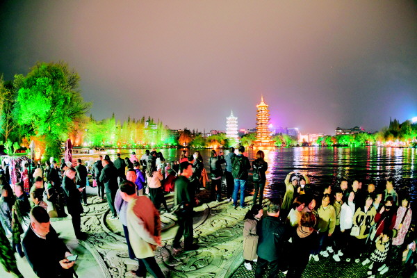 杉湖景区夜间的日月双塔每晚吸引大批游客打卡。