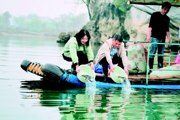 4月11日,七星区七星街道人大工委在穿山南社区大洲岛组织开展增殖放流活动,向漓江投放鱼苗100公斤。 记者苏展 摄