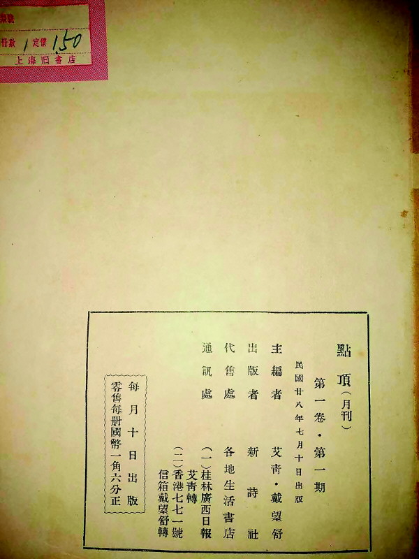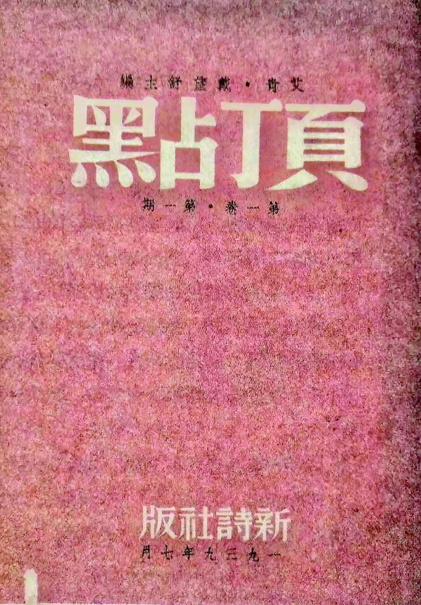 最近翻看抗战时期的期刊,无意中看到一本《顶点》。简洁的红色封面,大32开,共60余页,所有文字均从右向左排列。上方为三排,最上端一排黑色小字是“艾青·戴望舒主编”,中间为非常醒目的反白宋体大字“顶点”,再往下则又为一排黑色小字“第一卷·第一期”;下方两排,一排为反白的“新诗社版”,另一排为“一九三九年七月”。版权页则写明主编者:艾青、戴望舒,出版者:新诗社,代售处:各地生活书店,通讯处:桂林广西日报艾青转、香港七七一号信箱戴望舒转,每月十日出版,零售每册国币一角六分正。