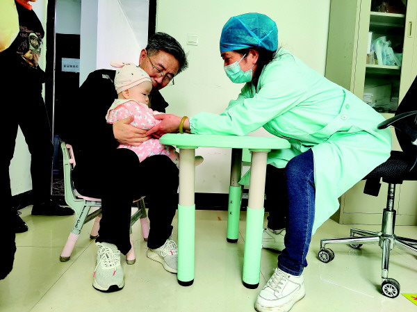 在七星区朝阳社区卫生服务中心内,医护人员正在为宝宝做生长发育测试。记者胡晓诗 摄
