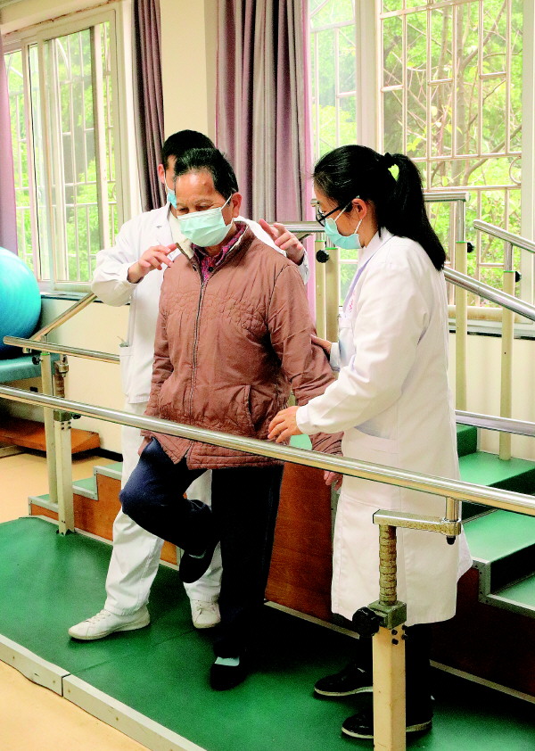 秦文卓主任和康复训练师正在帮助患者黄奶奶进行康复训练。记者刘菁 摄