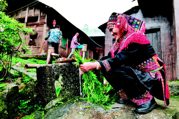 就着清清的山泉水,清洗刚采摘的野菜。